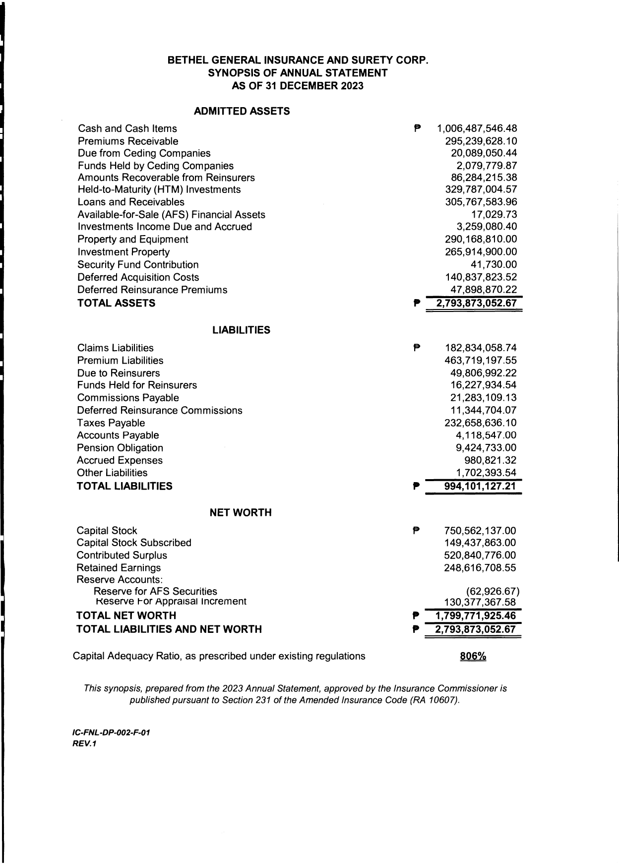 Synopsis of Annual Statements as of December 2023